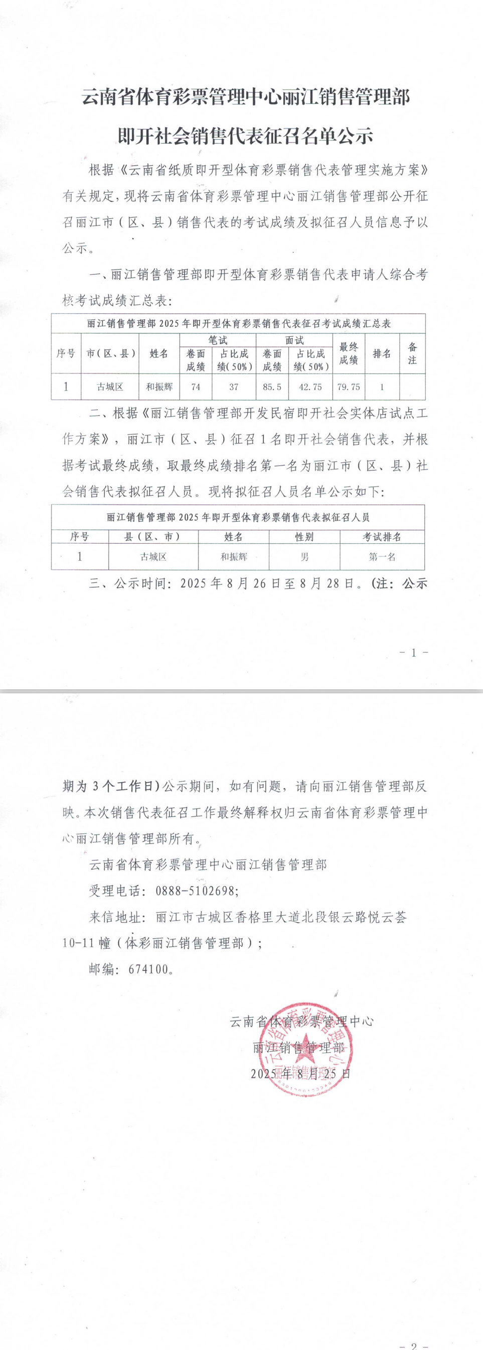 丽江销售管理部即开型体育彩票社会销售代表征召名单公示