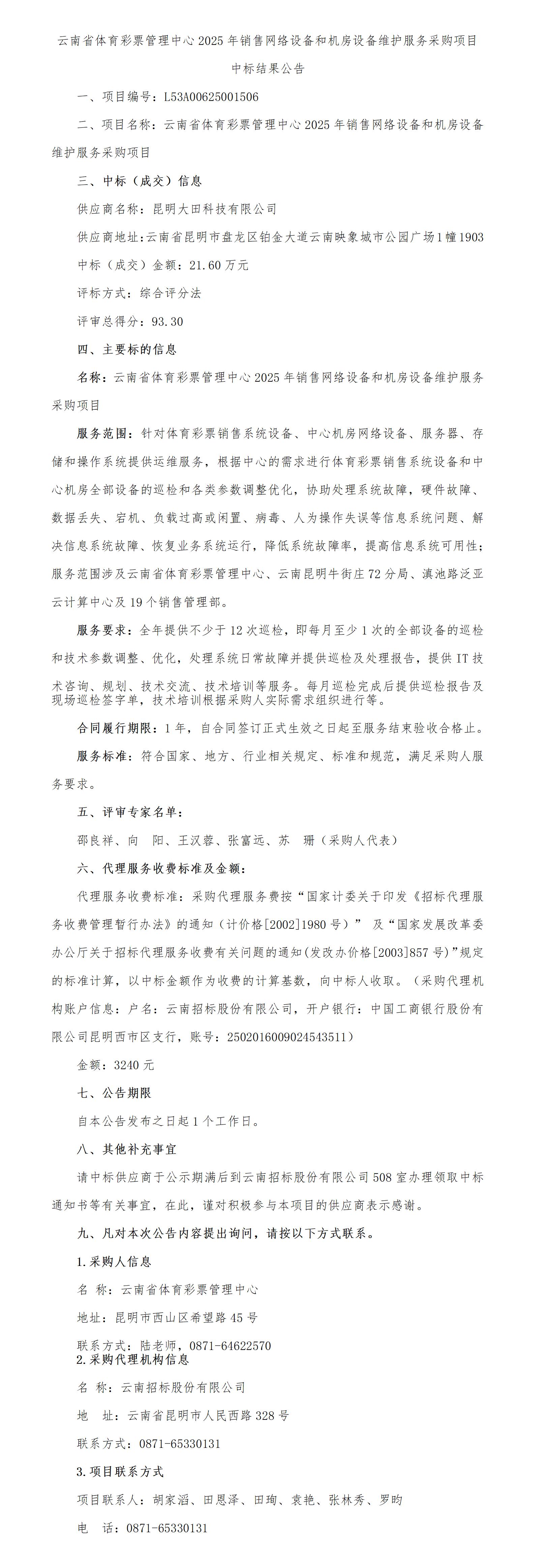 云南体彩2025年销售网络设备和机房设备维护服务采购项目中标结果公告