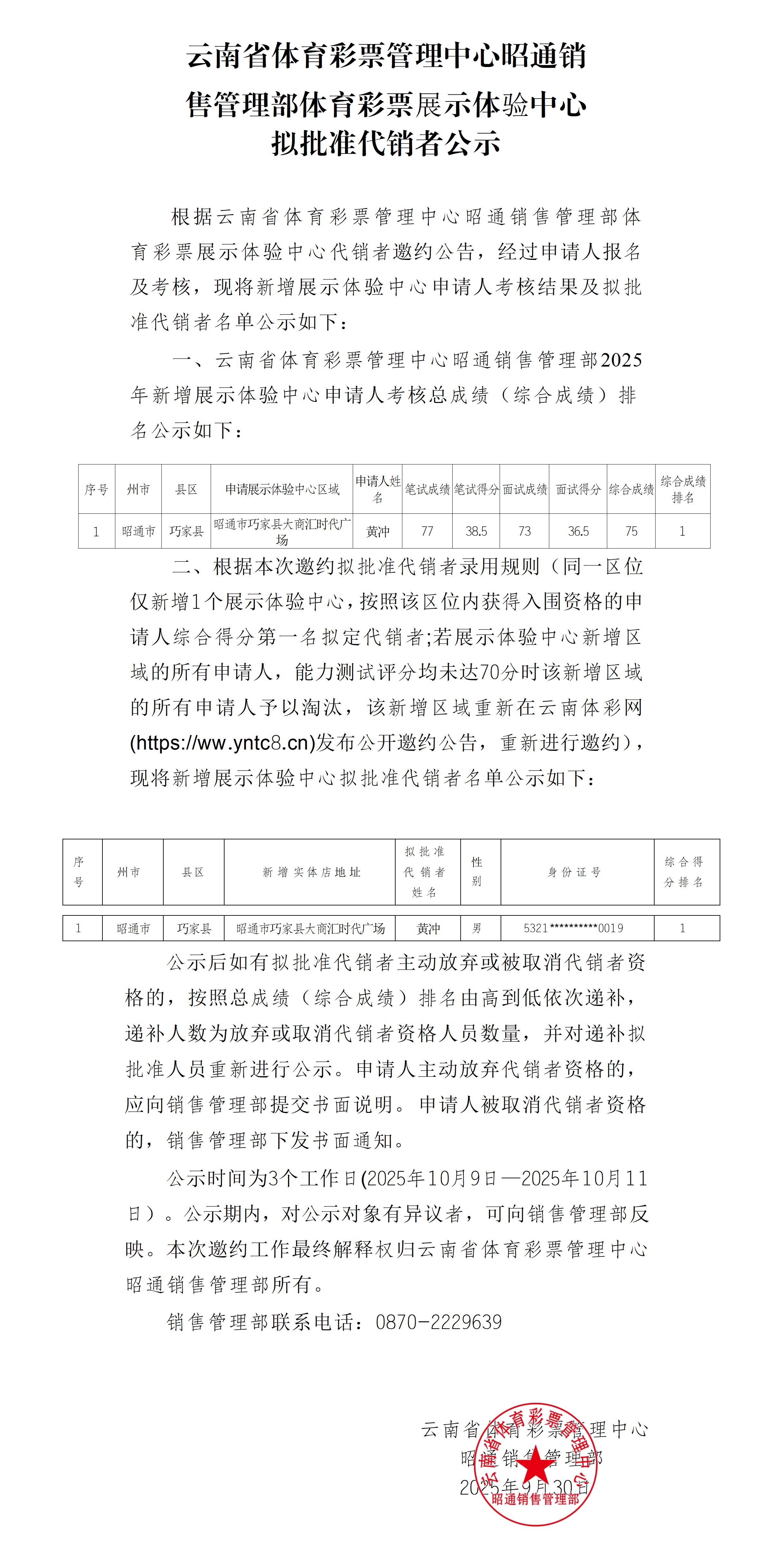 云南省体育彩票管理中心昭通销售管部体育彩票展示体验中心拟批准代销者公示
