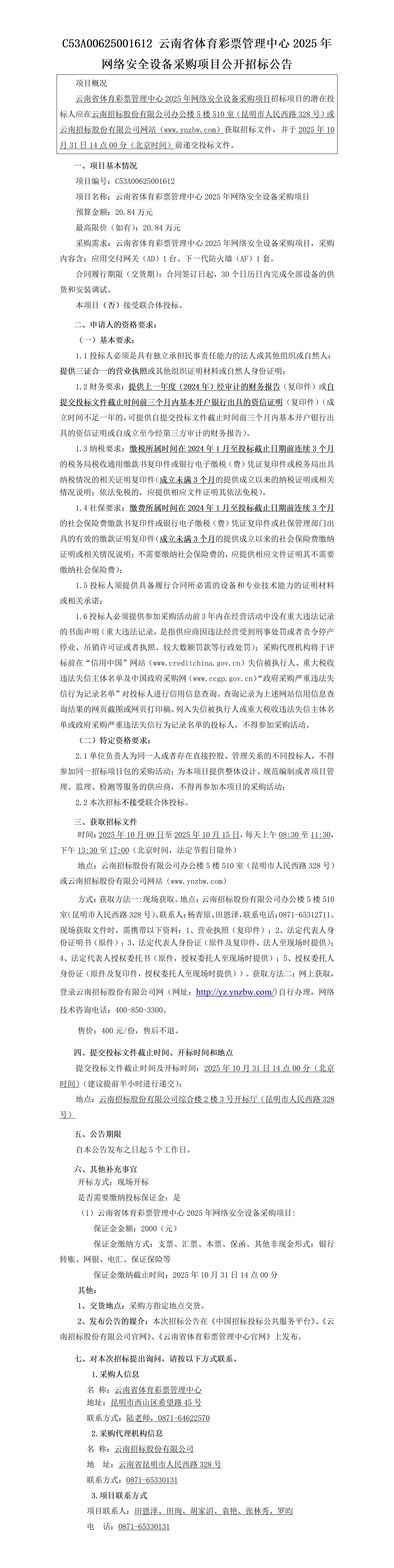 云南省体育彩票管理中心2025年网络安全设备采购项目公开招标公告
