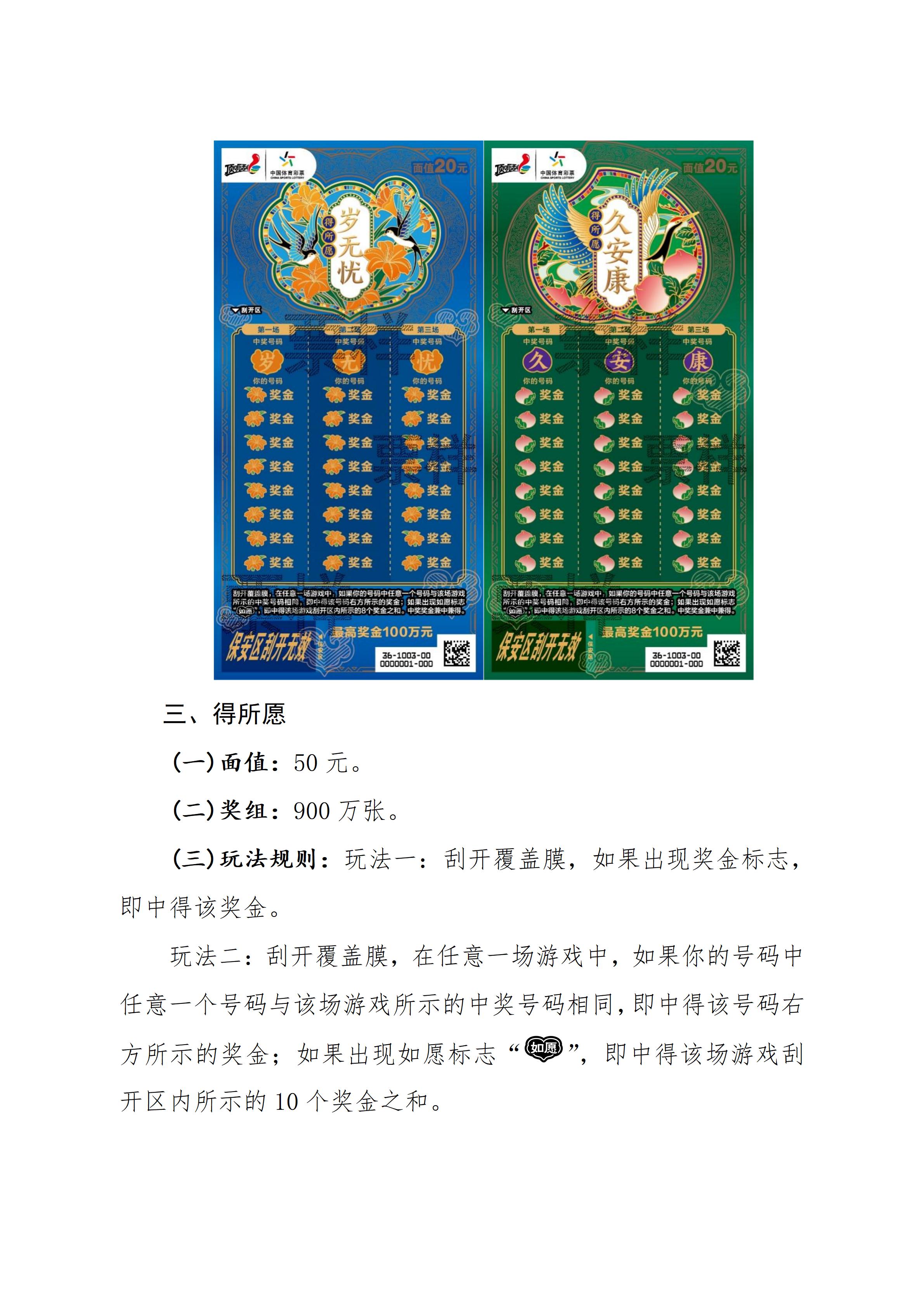 根据《财政部关于“为中国力量加油 雪舞龙腾”等14款即开型体育彩票游戏的审批意见》(财综〔2025〕36号)的要求,我中心将于2025年11月上市“得所愿”3款即开型体育彩票游戏,具体如下:10元“得所愿”、20元“得所愿”、50元“得所愿”。