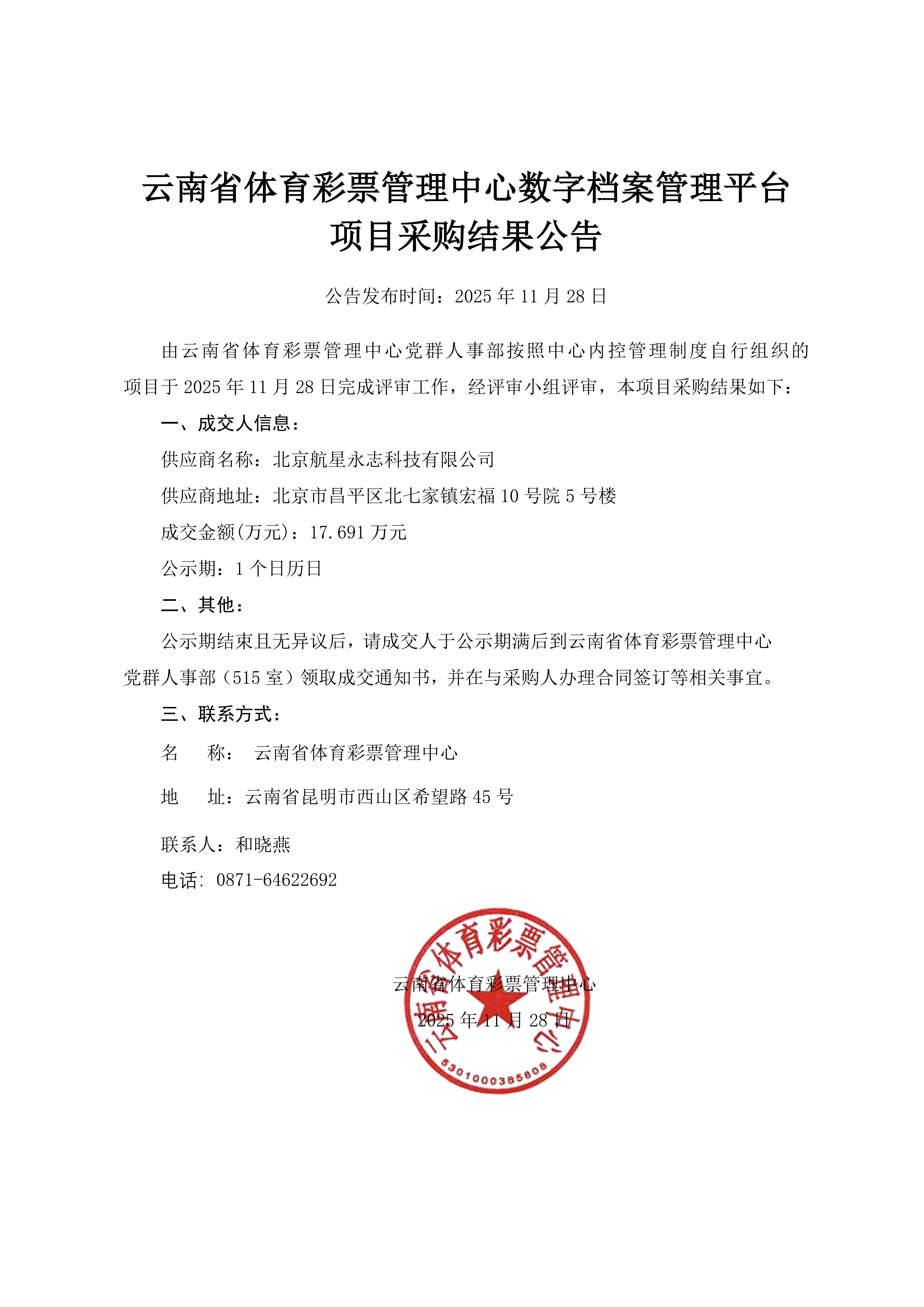 云南省体育彩票管理中心数字档案管理平台项目采购结果公告
