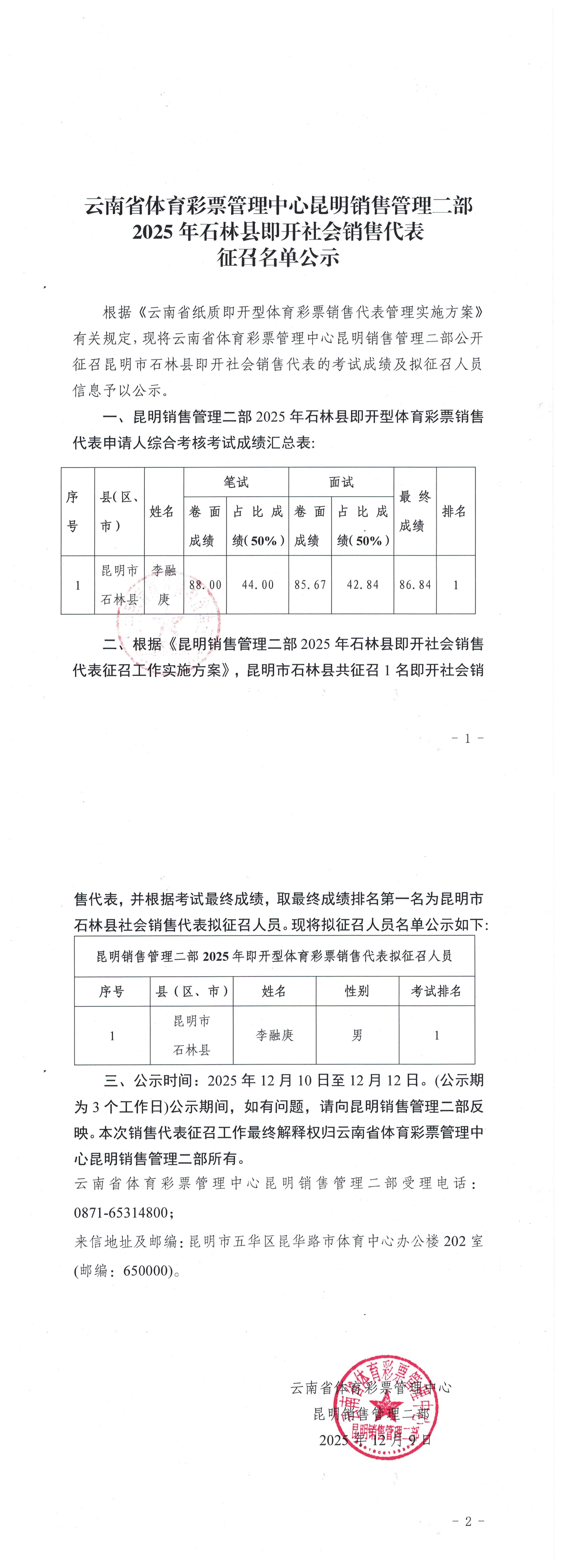 云南省体育彩票管理中心昆明销售管理二部2025年石林县即开社会销售代表征召名单公示
