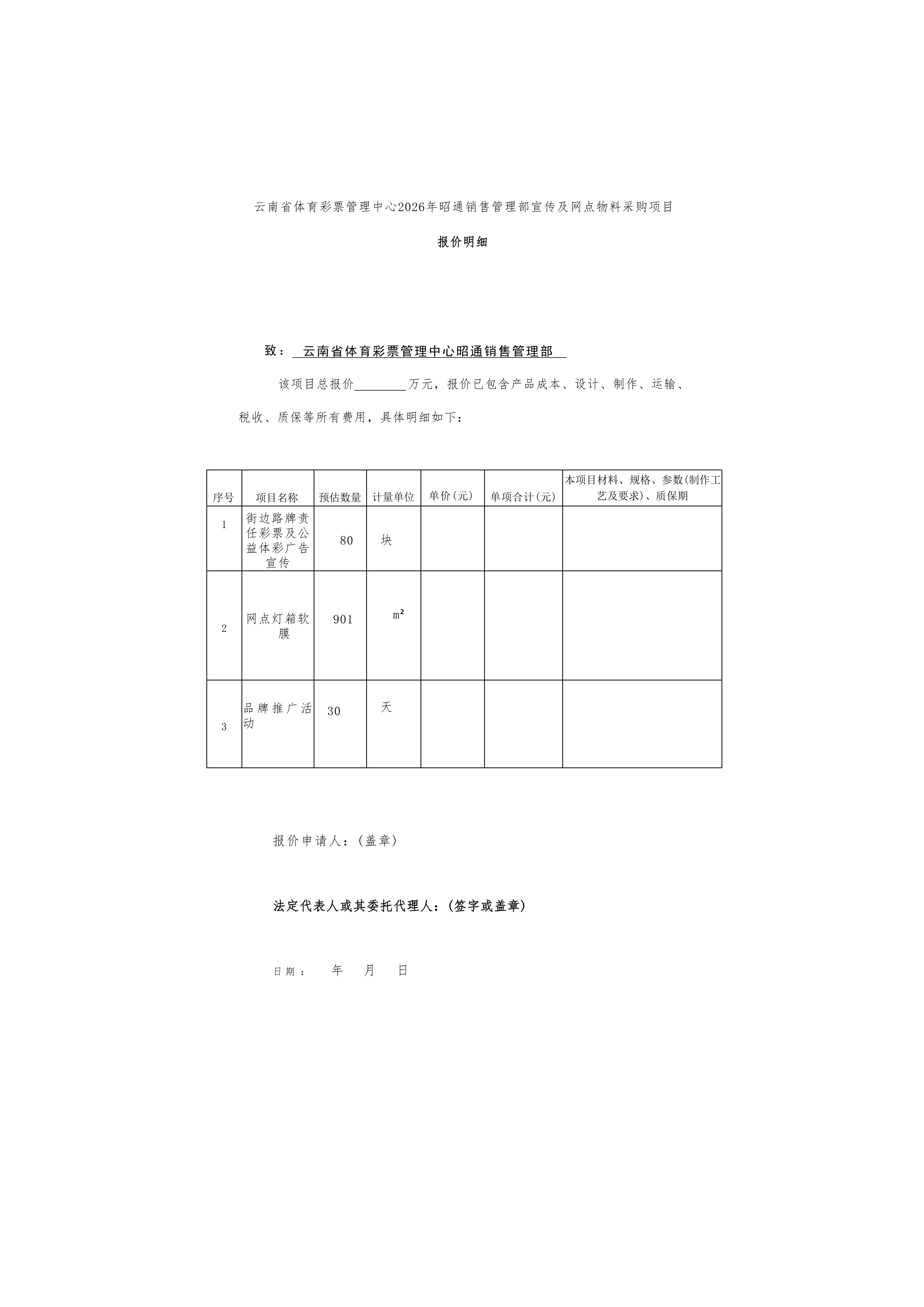 2026年昭通销售管理部宣传及网点物料采购项目询价函