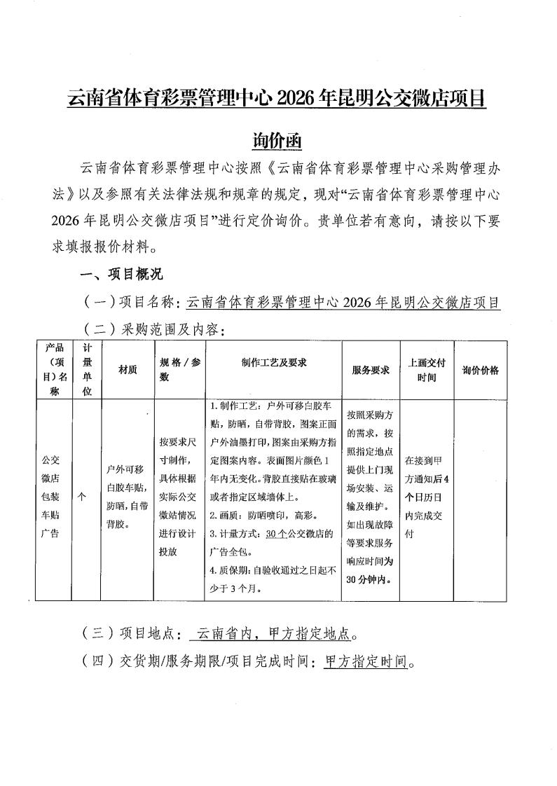 云南省体育彩票管理中心2026年昆明公交微店广告投放服务采购项目询价函