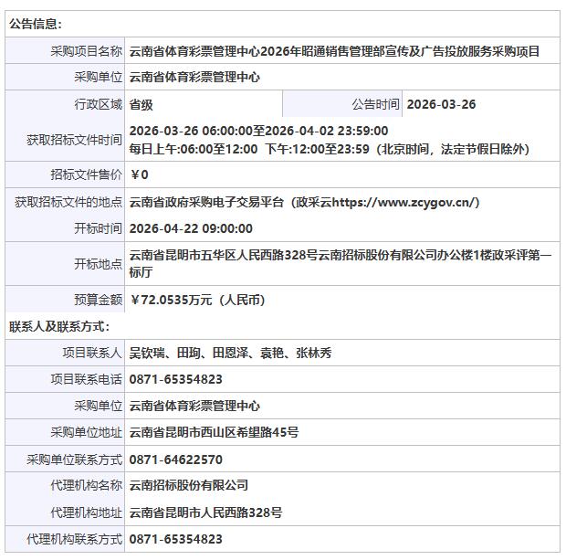 公告链接:云南省体育彩票管理中心2026年昭通销售管理部宣传及广告投放服务采购项目公开招标公告