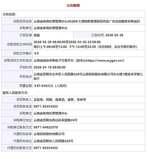 公告链接:云南省体育彩票管理中心2026年大理销售管理部宣传及广告投放服务采购项目公开招标公告