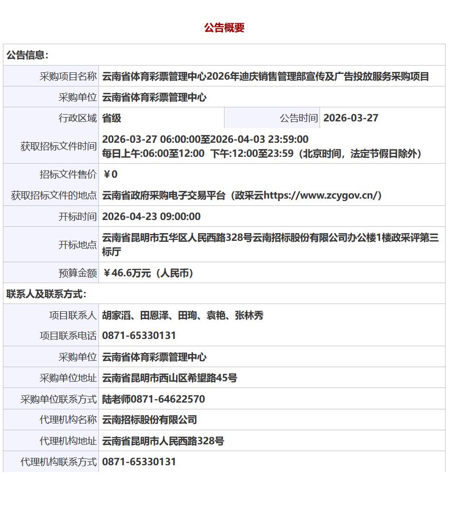 公告链接:云南省体育彩票管理中心2026年迪庆销售管理部宣传及广告投放服务采购项目公开招标公告