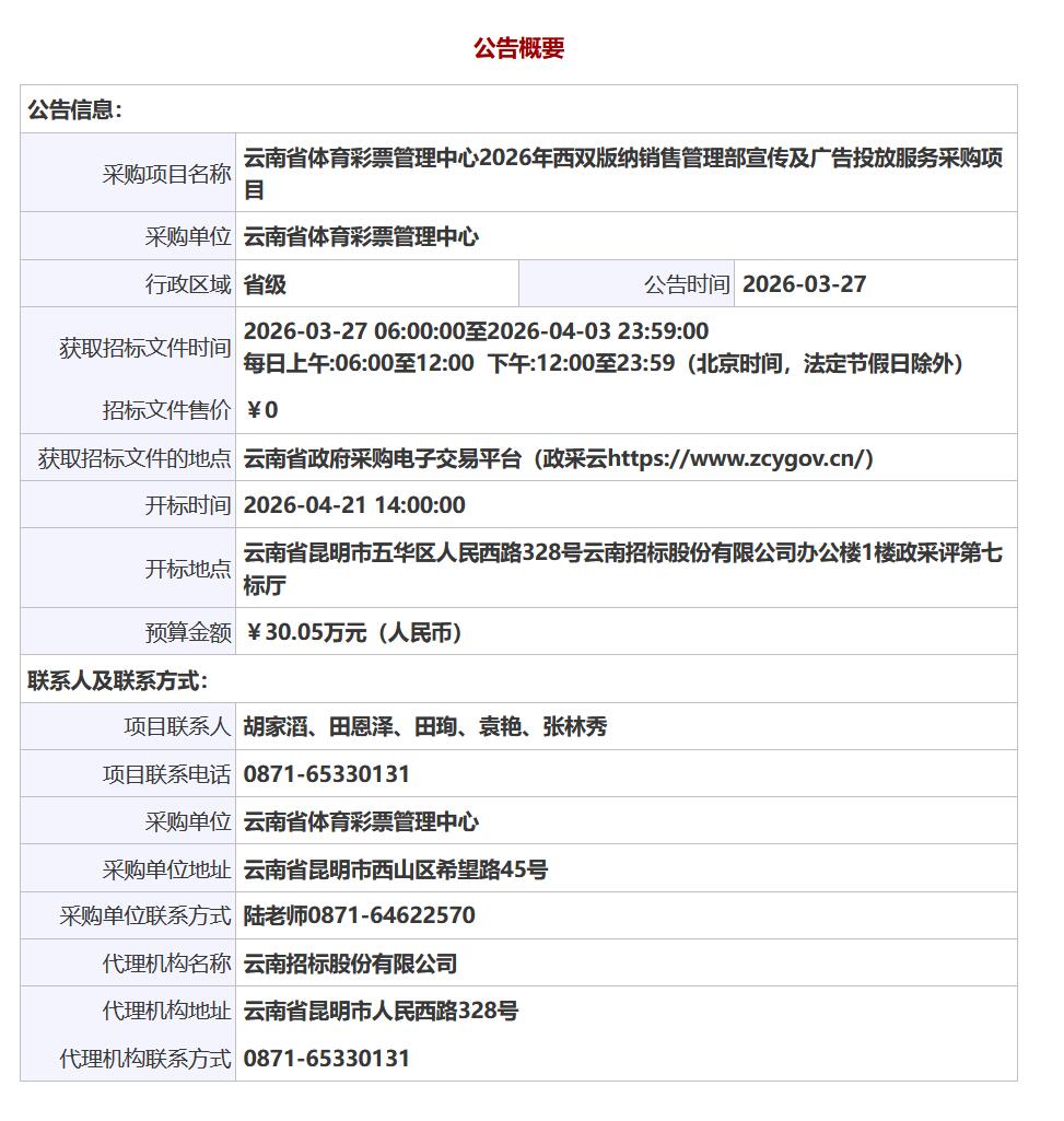 云南省体育彩票管理中心2026年西双版纳销售管理部宣传及广告投放服务采购项目公开招标公告