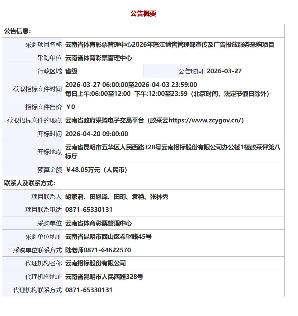 公告链接:云南省体育彩票管理中心2026年怒江销售管理部宣传及广告投放服务采购项目公开招标公告