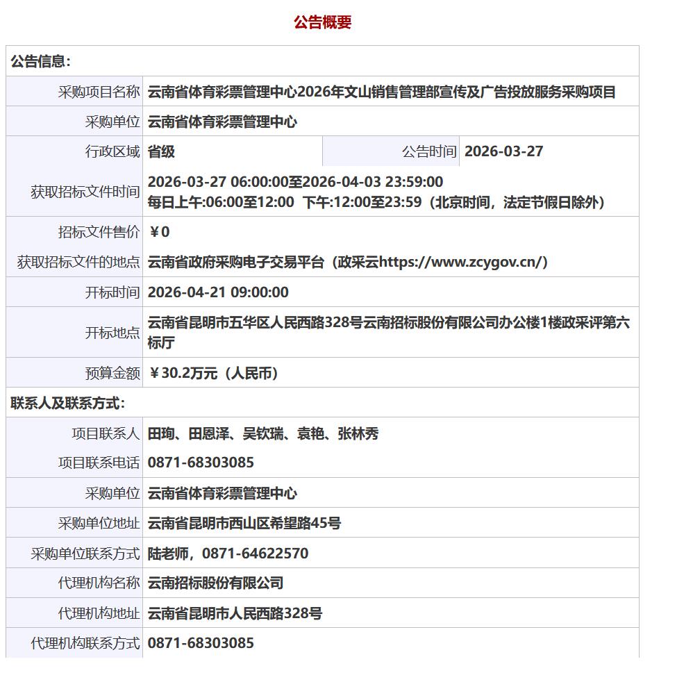 公告链接:云南省体育彩票管理中心2026年文山销售管理部宣传及广告投放服务采购项目公开招标公告