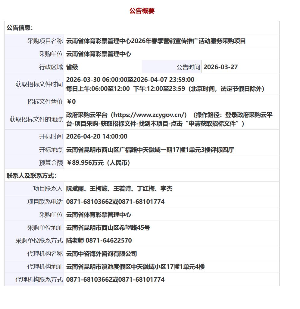 公告链接:云南省体育彩票管理中心2026年春季营销宣传推广活动服务采购项目招标公告