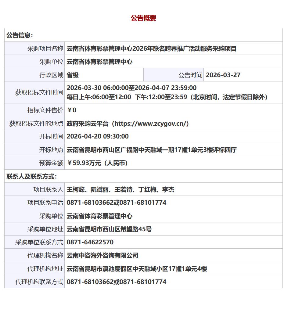 公告链接:云南省体育彩票管理中心2026年联名跨界推广活动服务采购项目招标公告
