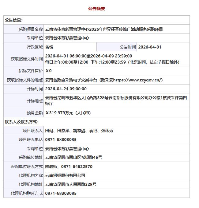 公告链接:云南省体育彩票管理中心2026年世界杯宣传推广活动服务采购项目公开招标公告