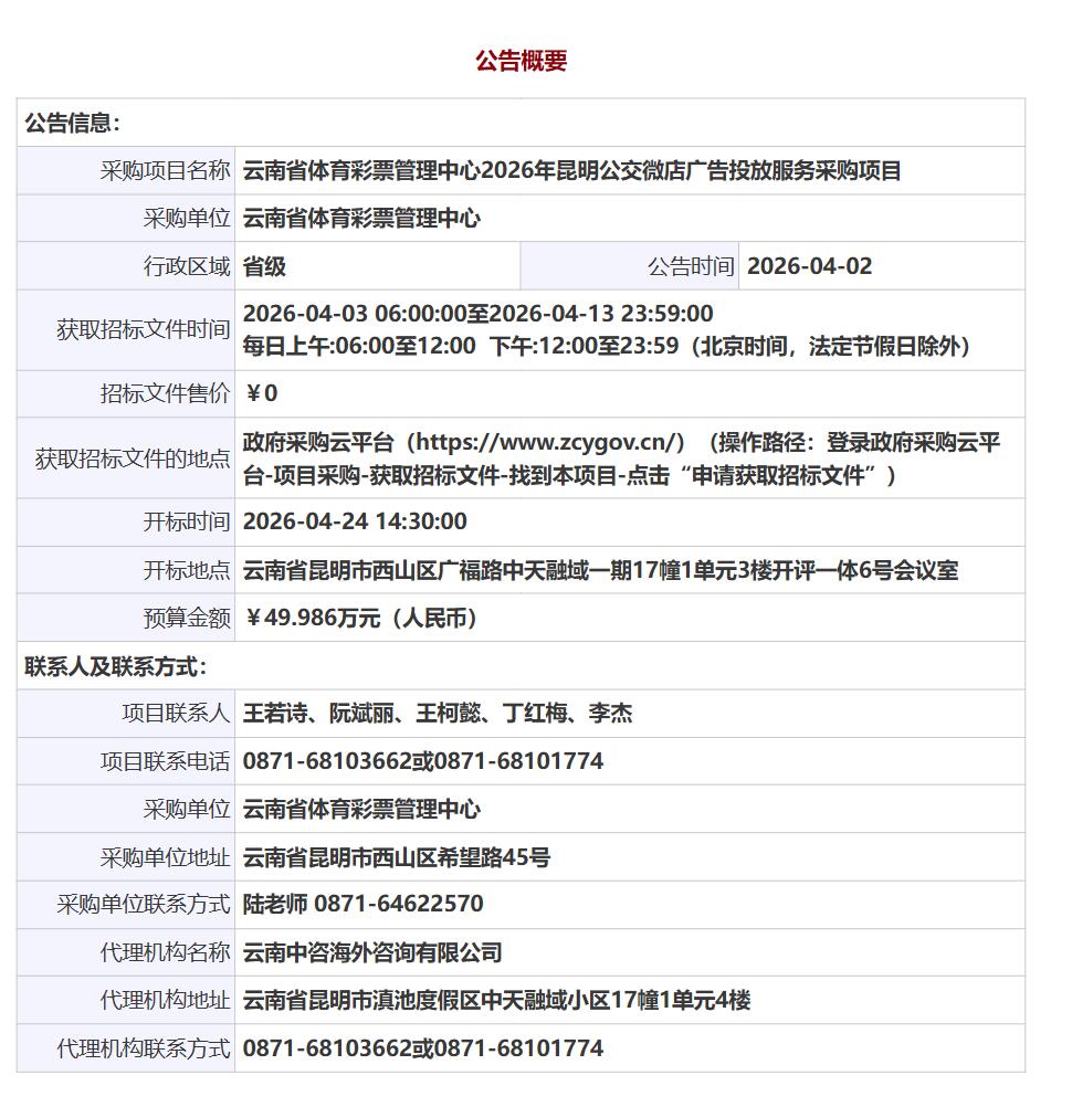公告链接:云南省体育彩票管理中心2026年昆明公交微店广告投放服务采购项目招标公告