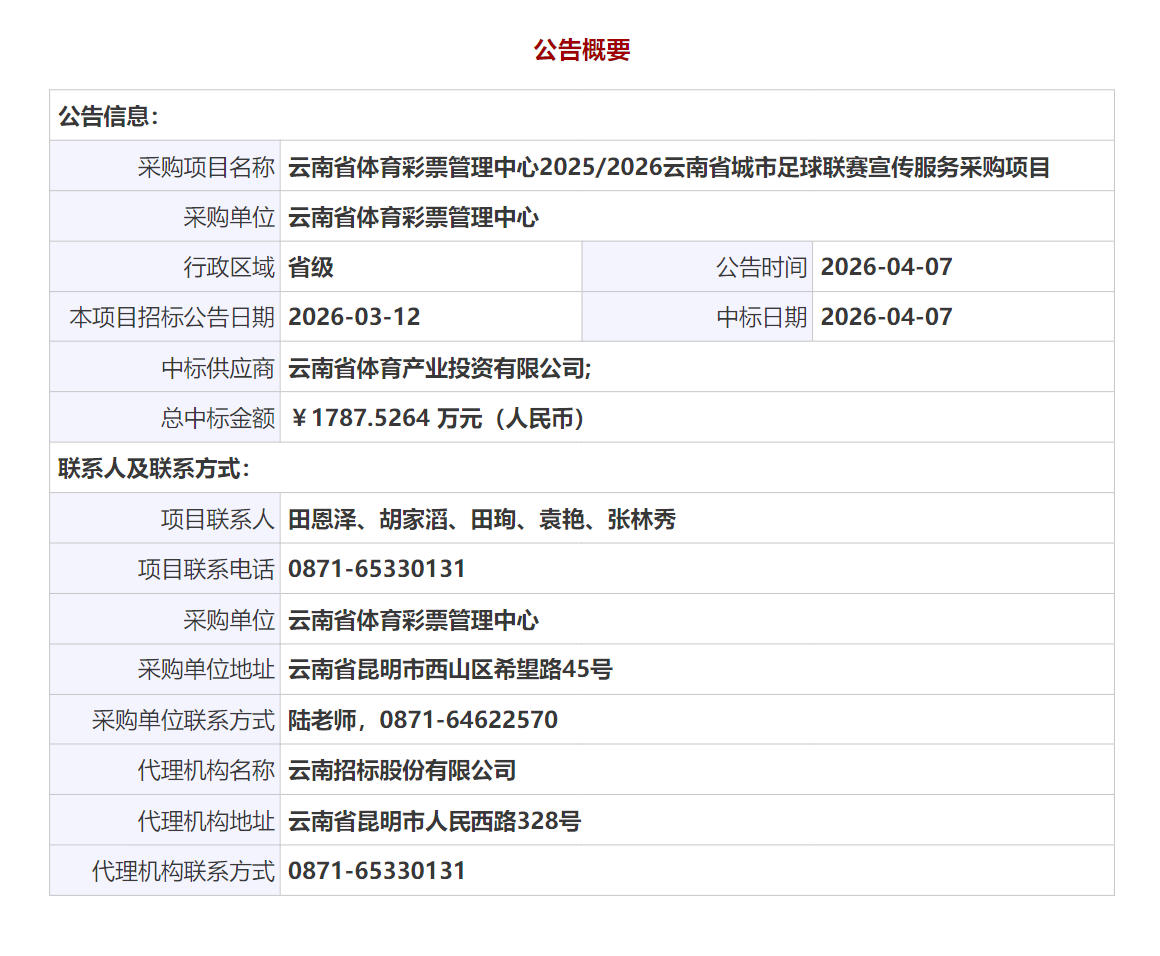 公告链接:云南省体育彩票管理中心2025/2026云南省城市足球联赛宣传服务采购项目中标公告