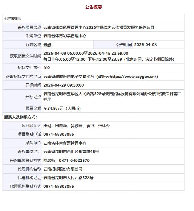 公告链接:云南省体育彩票管理中心2026年品牌内容传播宣发服务采购项目公开招标公告