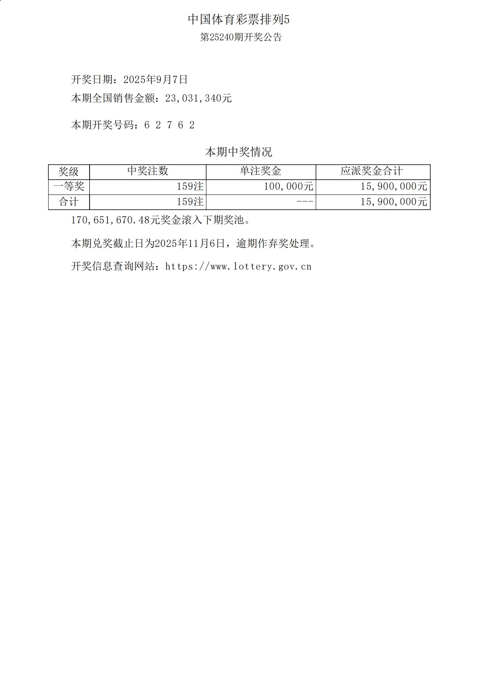 体彩排列5第25240期开奖公告