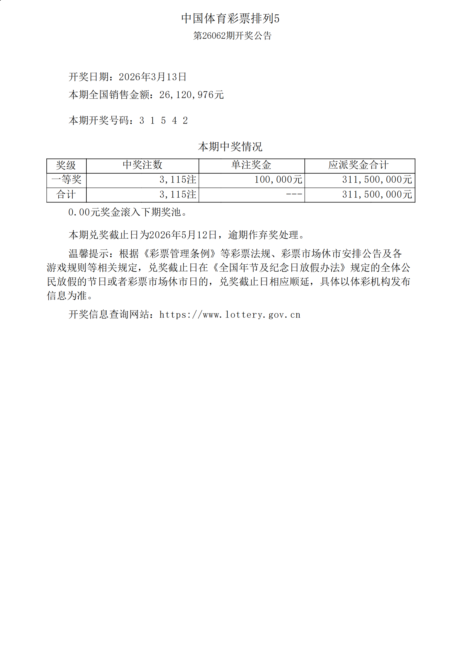 体彩排列5第26062期开奖公告