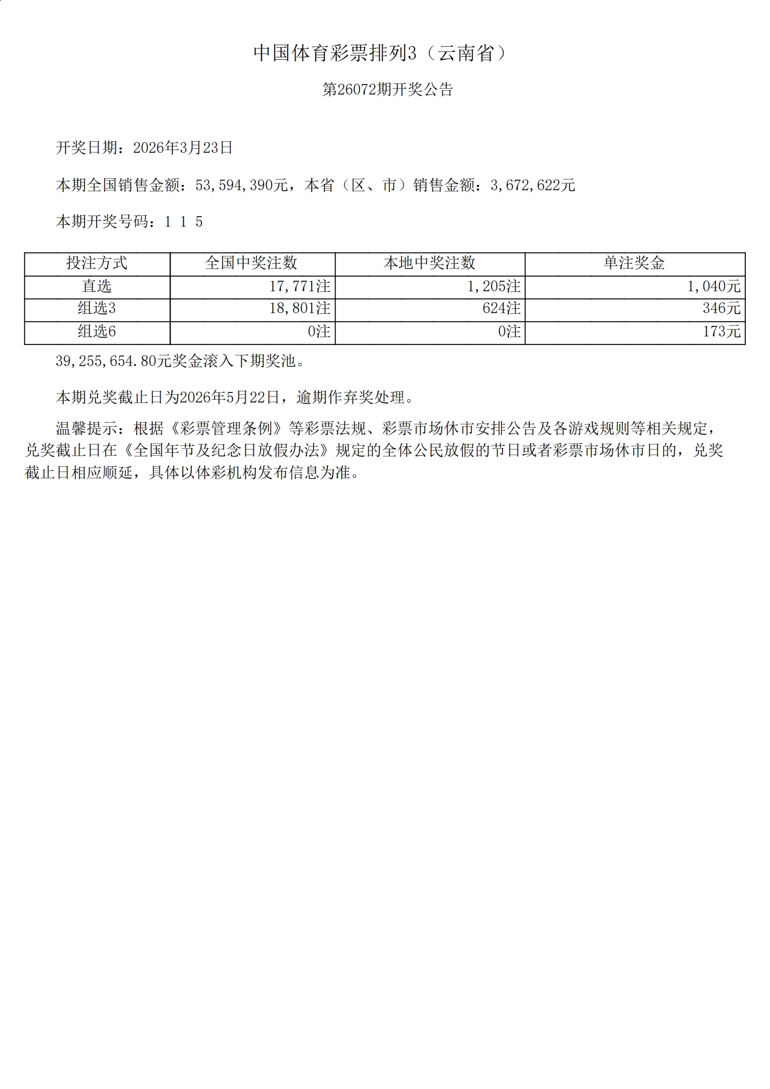 体彩排列3第26072期开奖公告