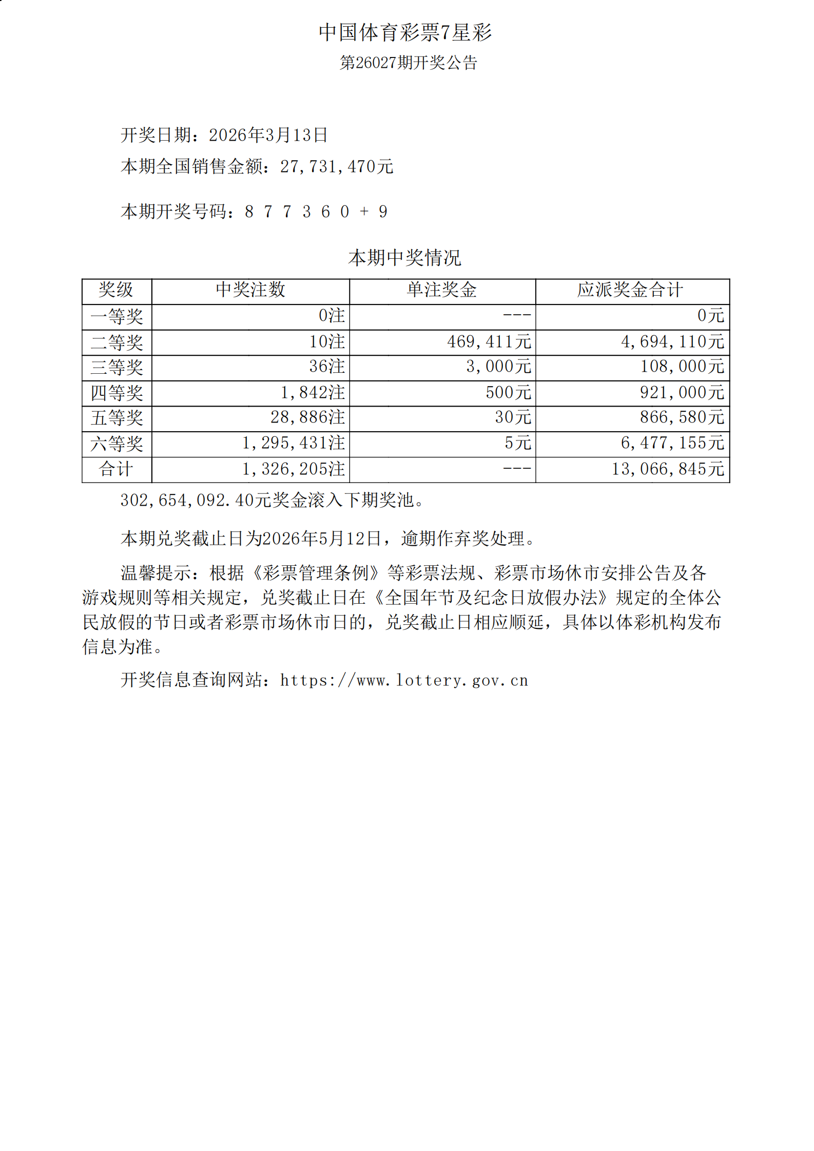 体彩7星彩26027期开奖公告